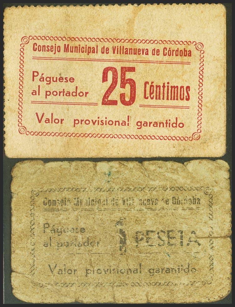 English VILLANUEVA DE CORDOBA (CORDOBA). 25 Cents and 1 Peseta. (1937ca). (González: 5634, 5636). rare. Extremely Fine/ Almost Fine.