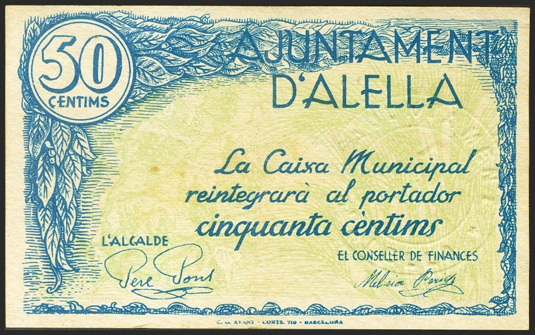 English ALELLA (BARCELONA). 50 cents. (1937ca). (Gonzalez: 6159). Good Extremely Fine.