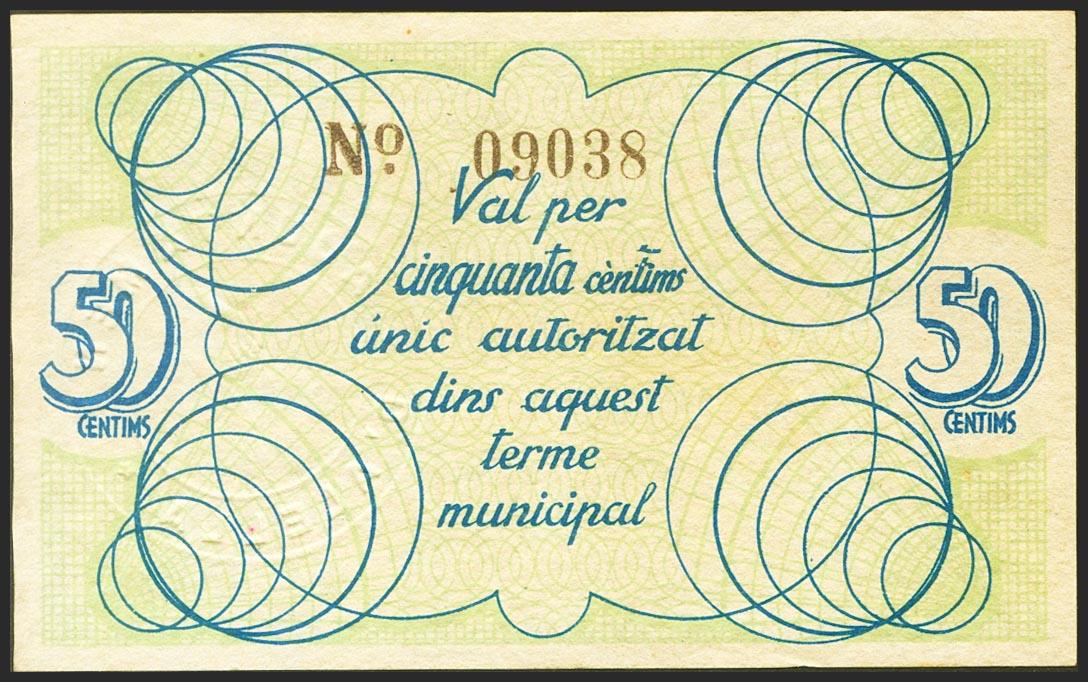 English ALELLA (BARCELONA). 50 cents. (1937ca). (Gonzalez: 6159). Good Extremely Fine.
