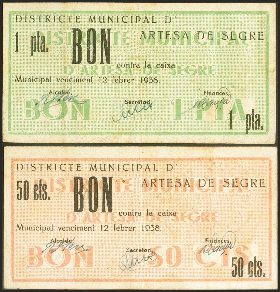 English ARTESA DE SEGRE (LERIDA). 50 Cents and 1 Peseta. July 12, 1937. (González: 6431/32). Rare complete series. Good Very Fine.