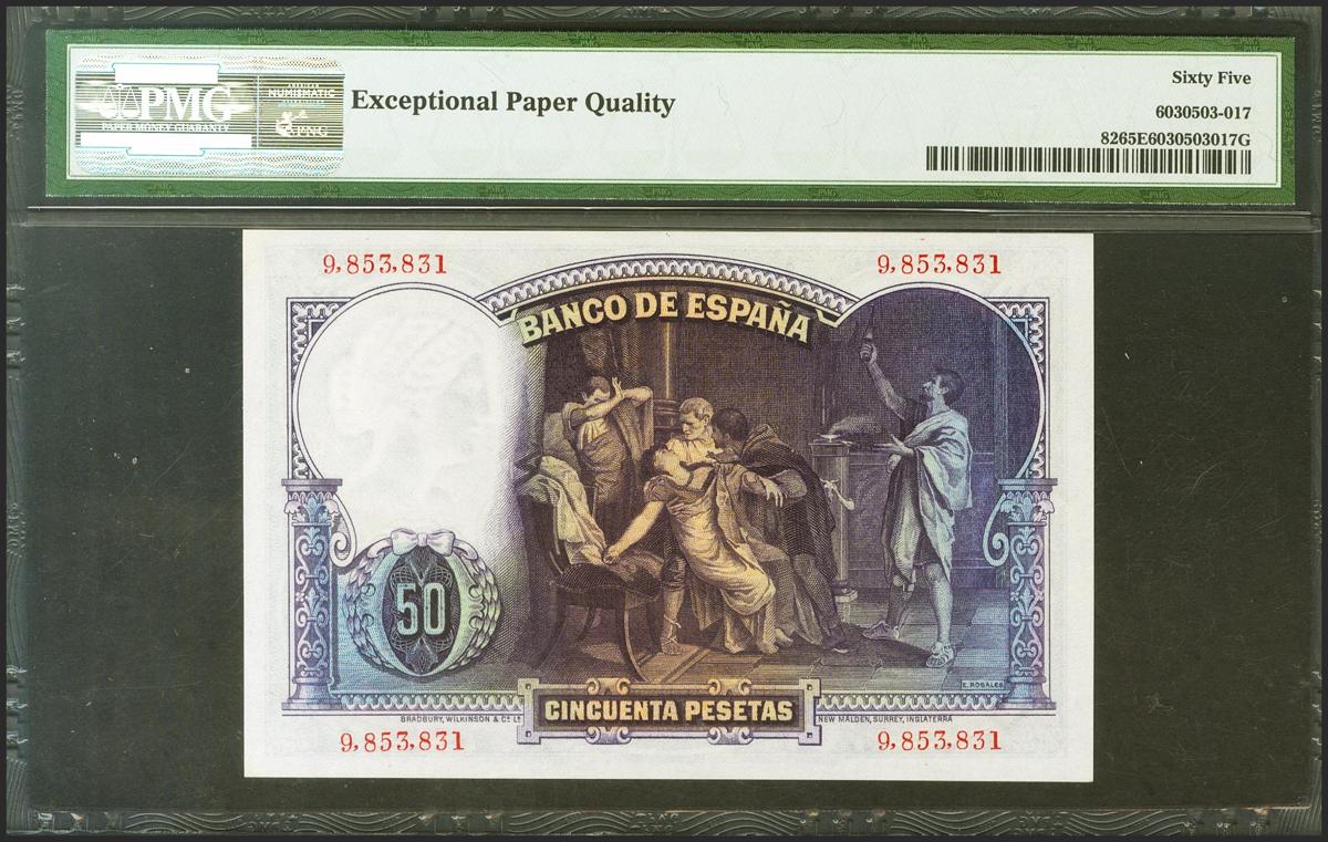 English 50 pesetas. April 25, 1931. No series. (Edifil 2021: 359, Pick: 82). Unusual like that, original sizing. Uncirculated. Encapsulated PMG65EPQ.
