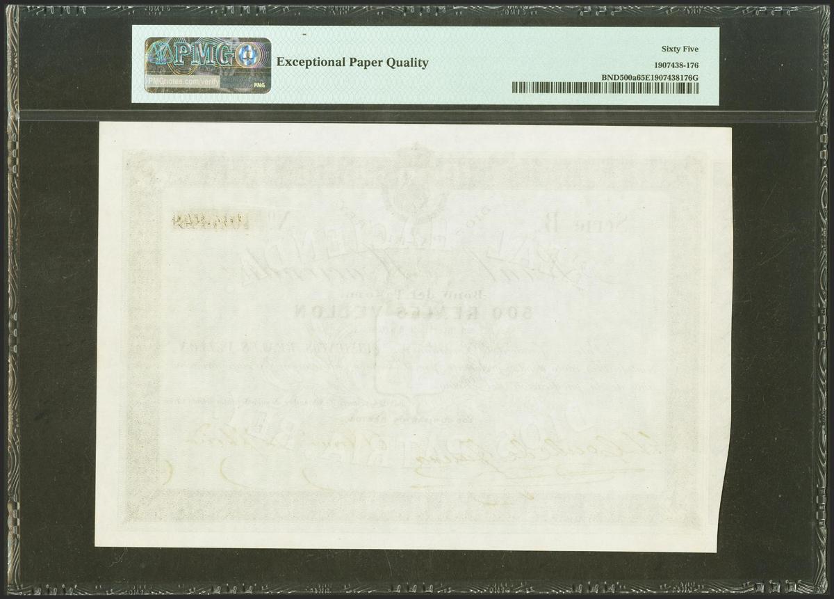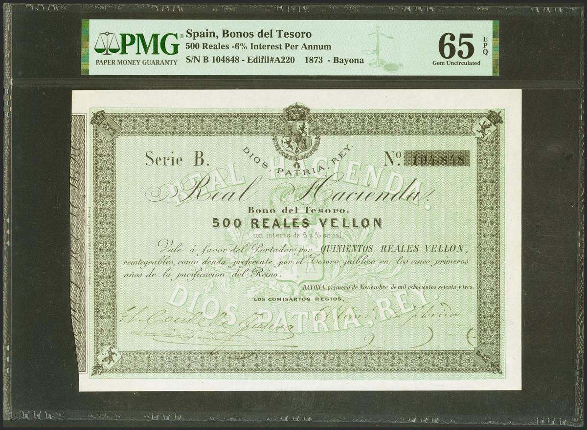 500 Reales of Fleece. November 1, 1873. Real Treasury. Series B. (Edifil 2021: 211). Original sizing. Uncirculated. PMG65EPQ package.