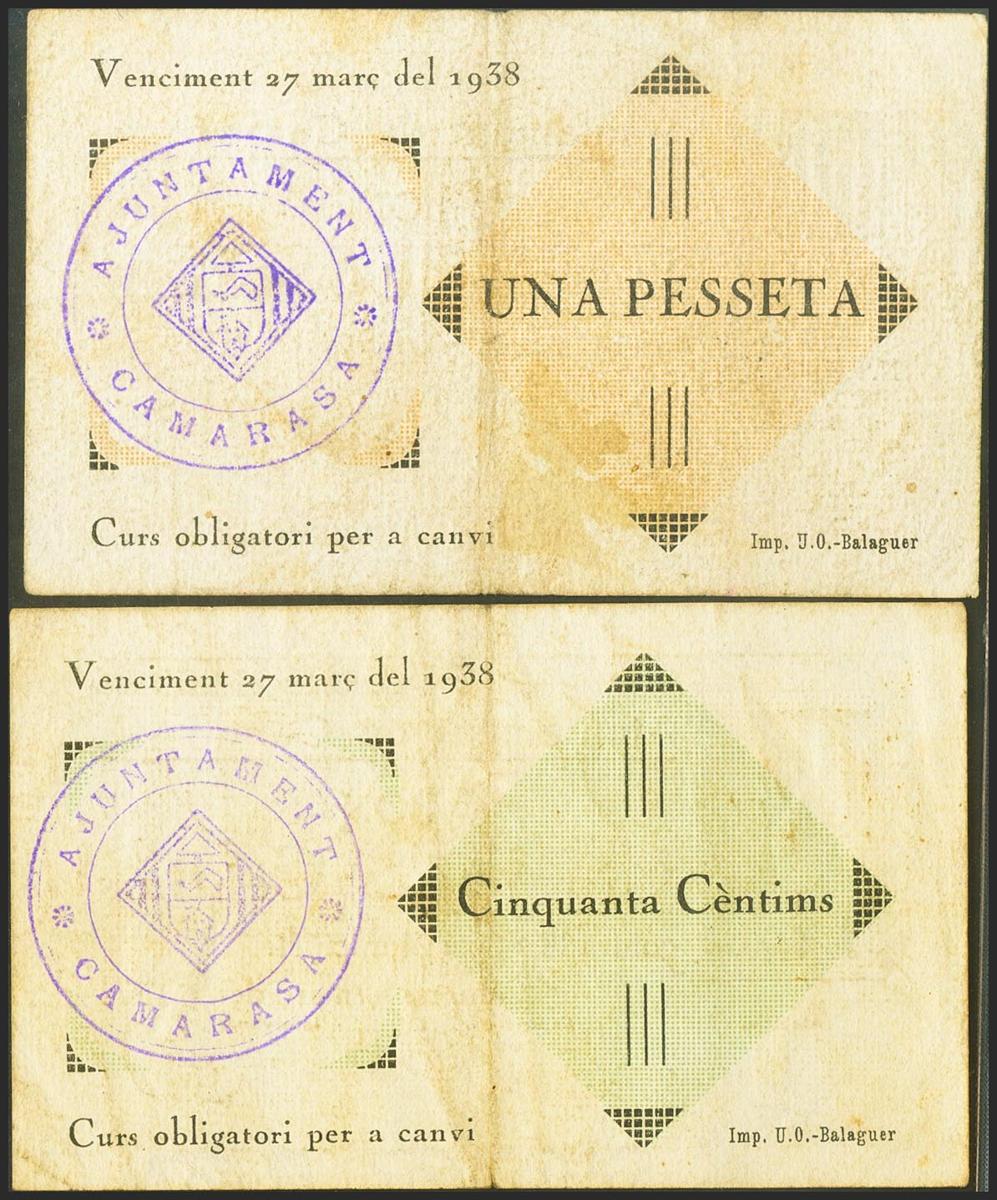 CHAMBER (LERIDA). 50 Cents and 1 Peseta. March 1937. (González: 7315/16). Rare complete series. Very Fine/ Almost Very Fine.