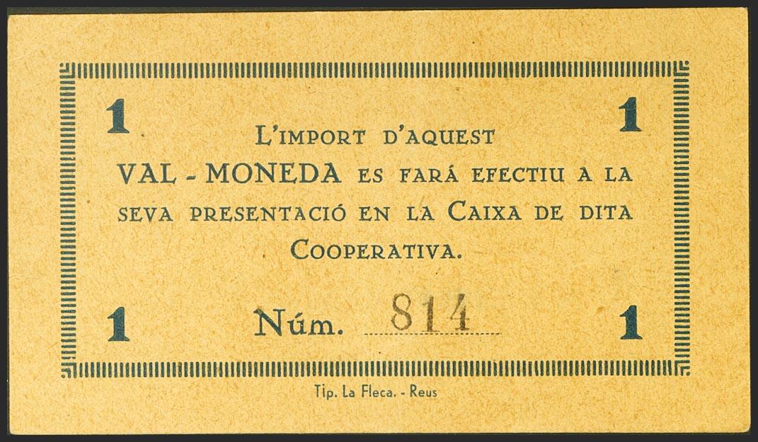 English CERVIA DE LES GARRIGUES (LERIDA). 1 Peseta. (1937ca). Cooperativa UGT González catalogs a 25 cts and 50 cts bill from a similar series, it could be considered that this value of 1 pts, not catalogued, is the complement. Good Extremely Fine.