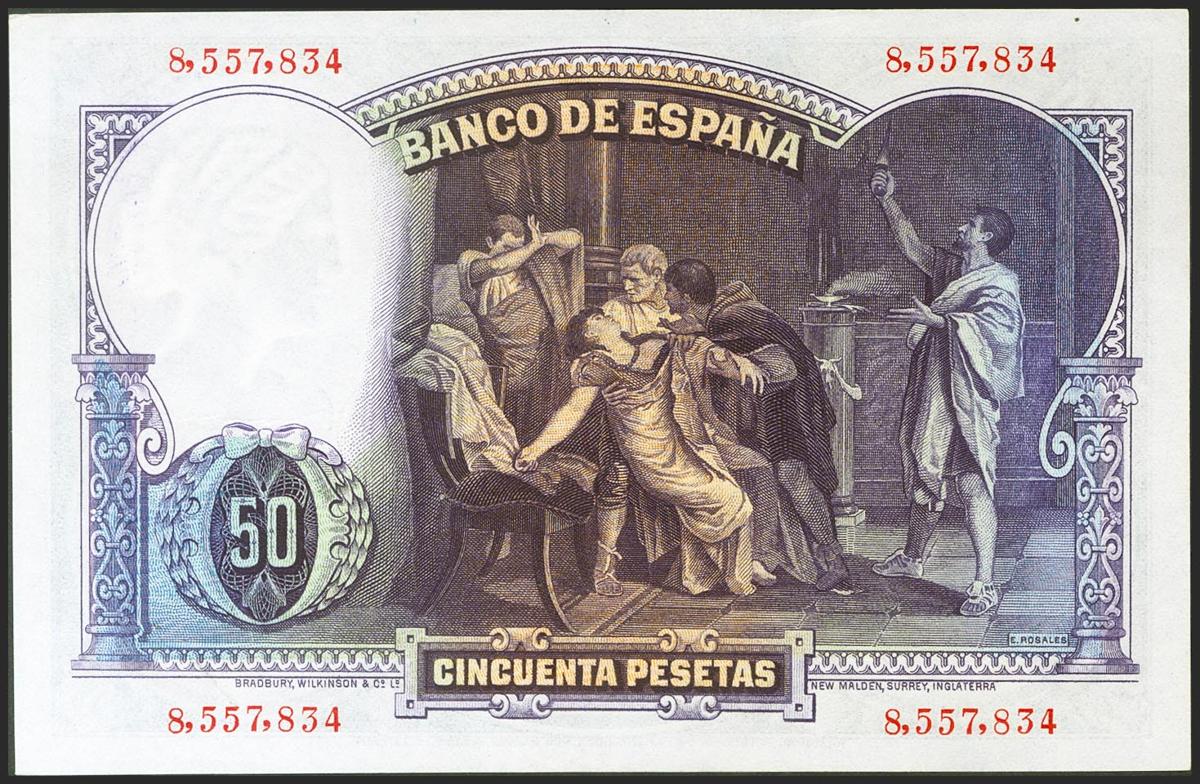 50 pesetas. April 25, 1931. No series. (Edifil 2021: 359). Rare in this exceptional quality, it retains all of its original sizing. Uncirculated.
