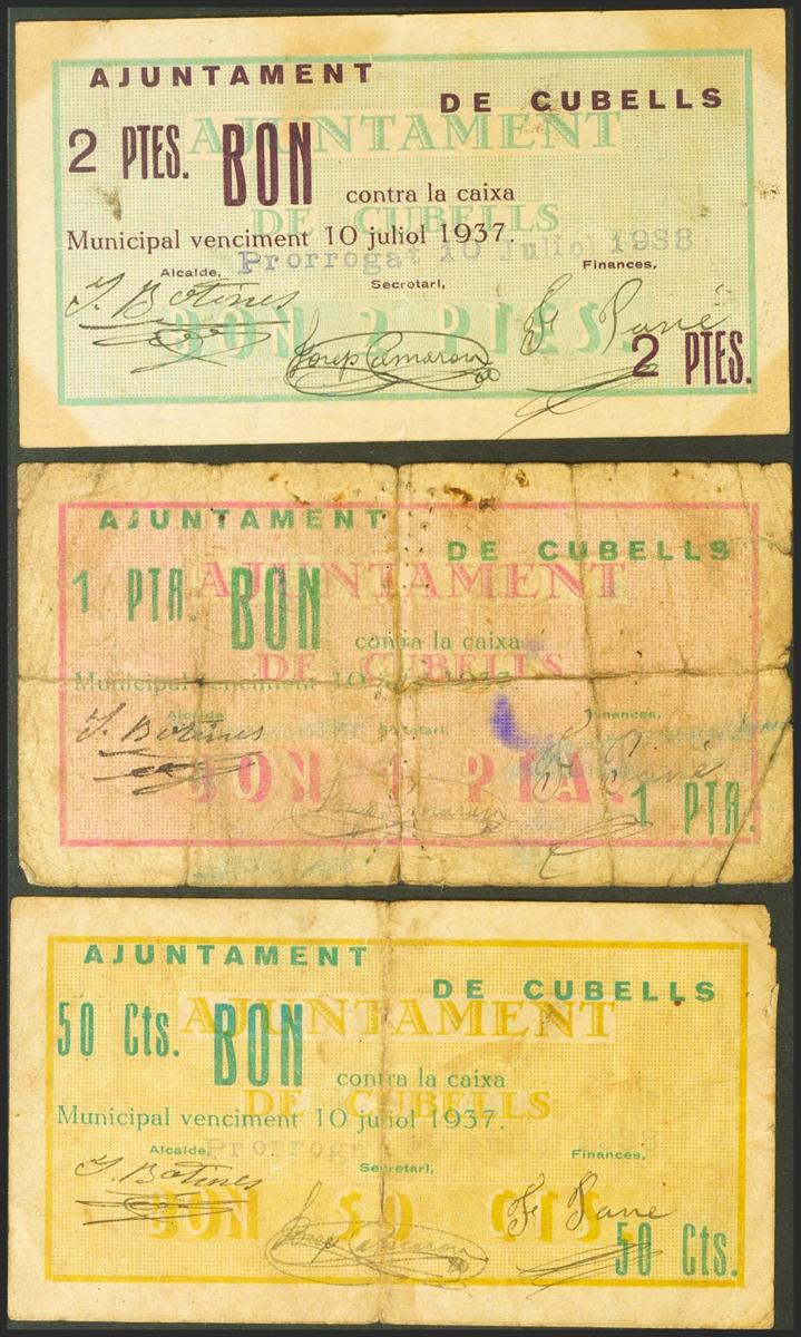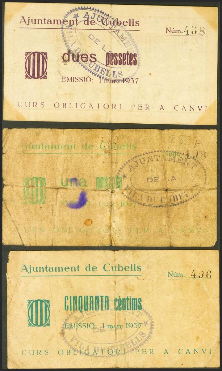 CUBELLS (LERIDA). 50 Cents, 1 Peseta and 2 Pesetas. March 1, 1937. (González: 7704/06). Very rare complete series. Very Fine/ Almost Fine.