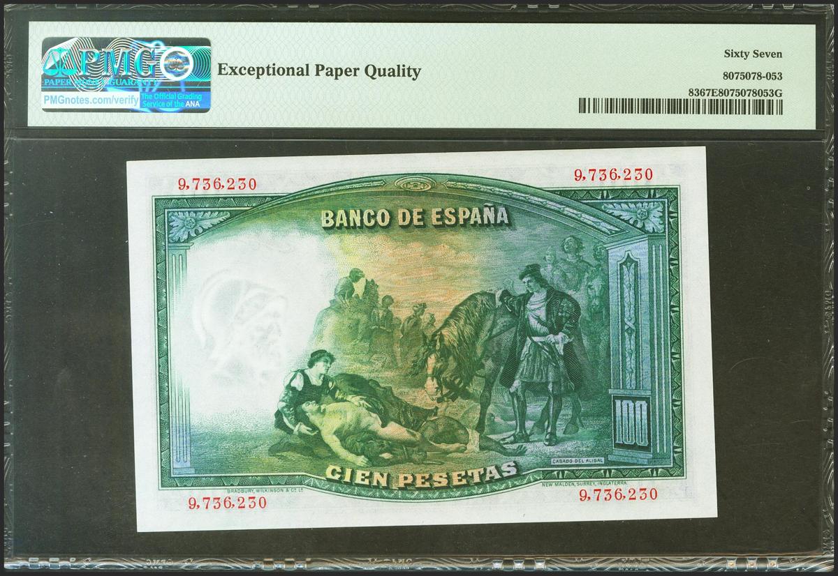 100 pesetas. April 25, 1931. No series. (Edifil 2021: 360, Pick: 83). Extraordinarily rare in this exceptional quality, original sizing. Uncirculated. PMG67EPQ package.