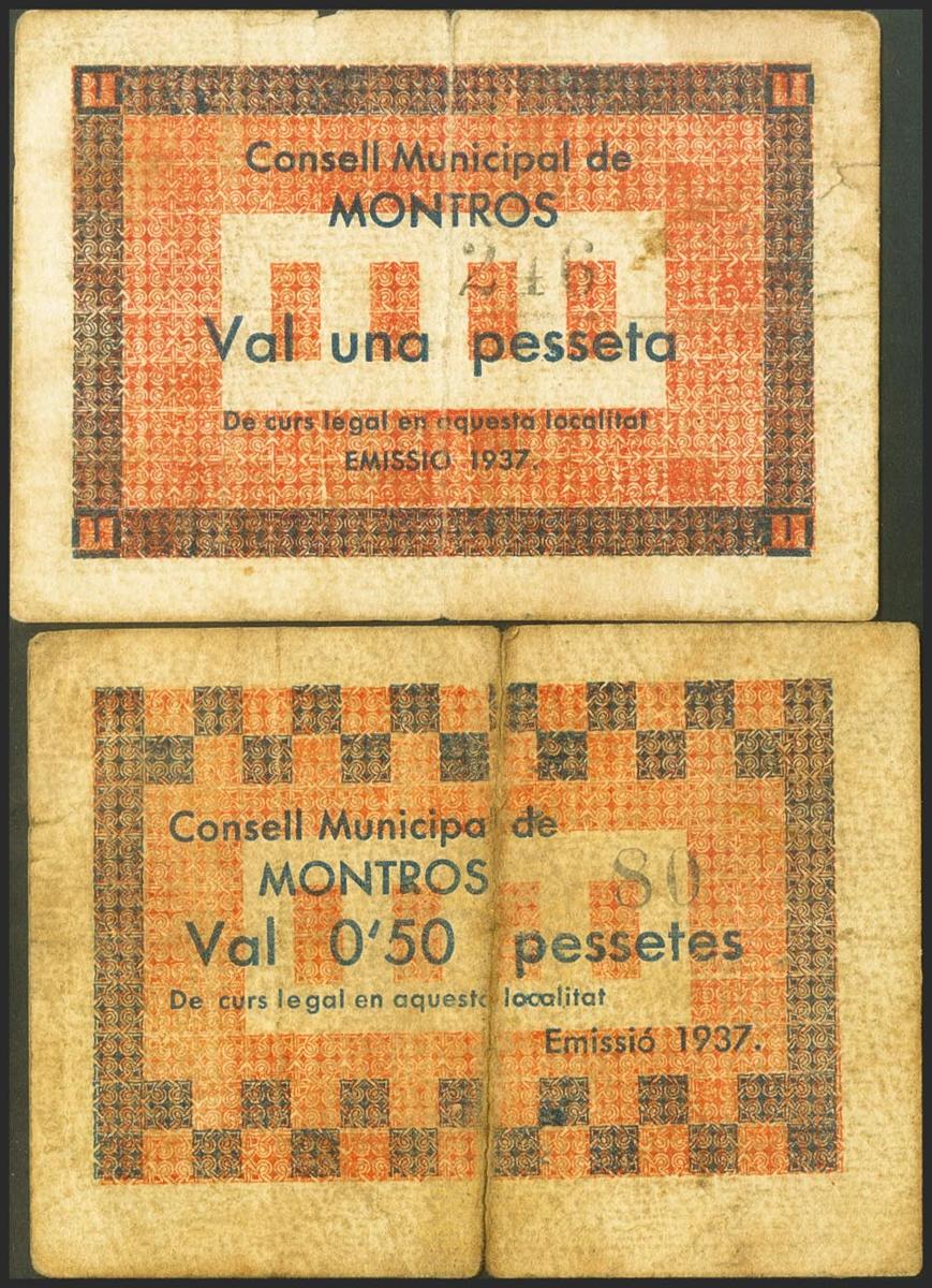 English MONTROS (LERIDA). 50 Cents and 1 Peseta. 1937. (Gonzalez: 8826/27). Very rare complete series. Very Fine/ Almost Very Fine.