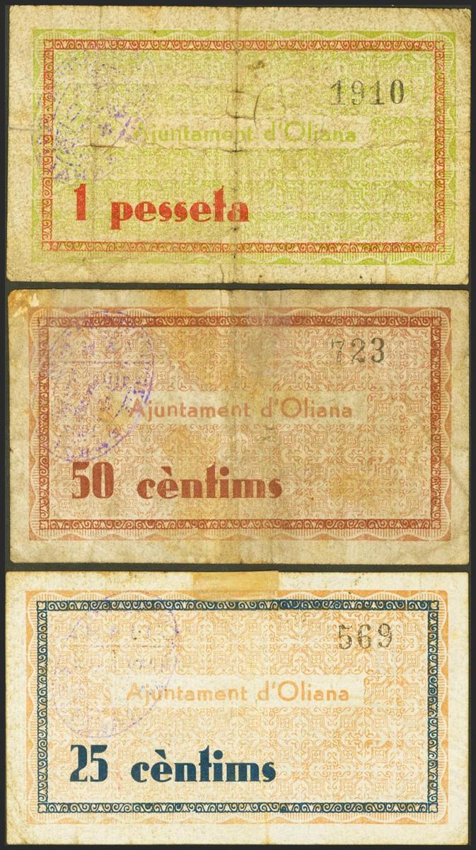 OLIANA (LERIDA). 25 Cents, 50 Cents and 1 Peseta. August 20, 1937. (González: 8942/44). Rare complete series. Almost Very Fine.