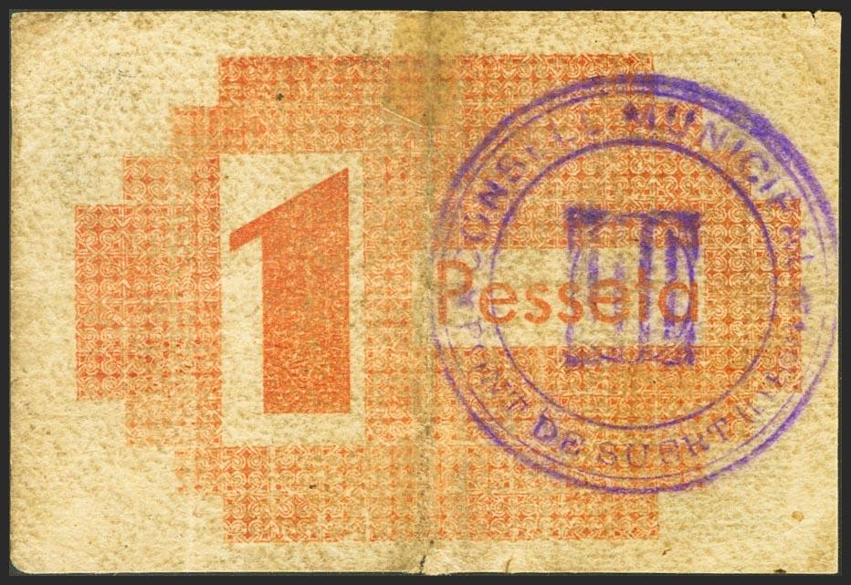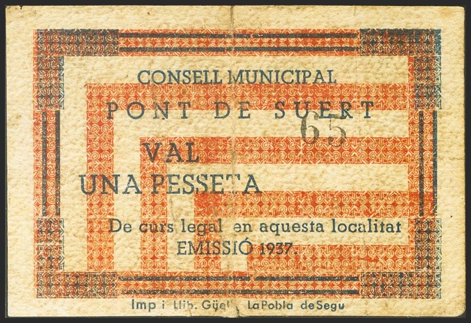THE PONT OF LUCK (LERIDA). 1 Peseta. 1937. (Gonzalez: 9380). Rare. Almost Very Fine.