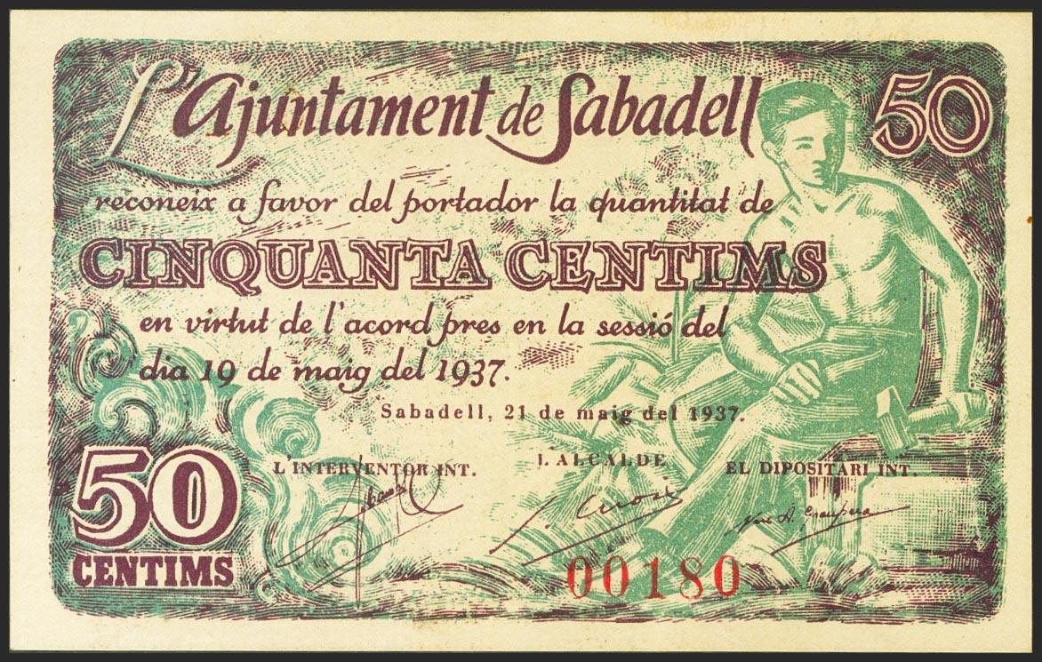 SABADELL (BARCELONA). 50 cents. May 19, 1937. (González: 9776). Almost Uncirculated.