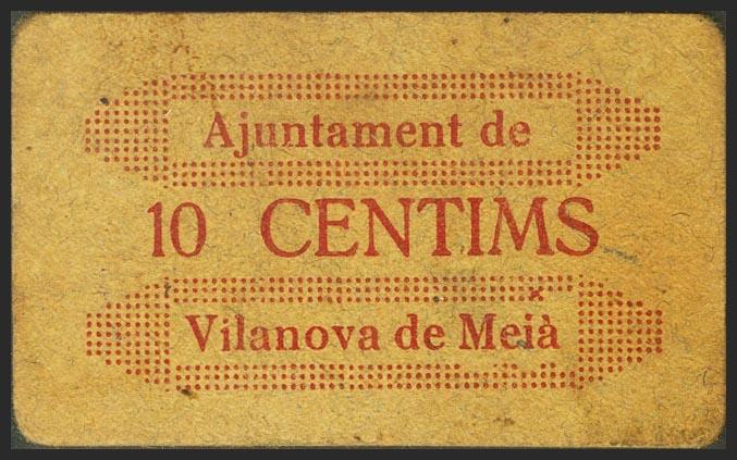 VILANOVA DE MEIA (LERIDA). 10 cents. (1937ca). (Gonzalez: 10818). Very rare. Good Very Fine.