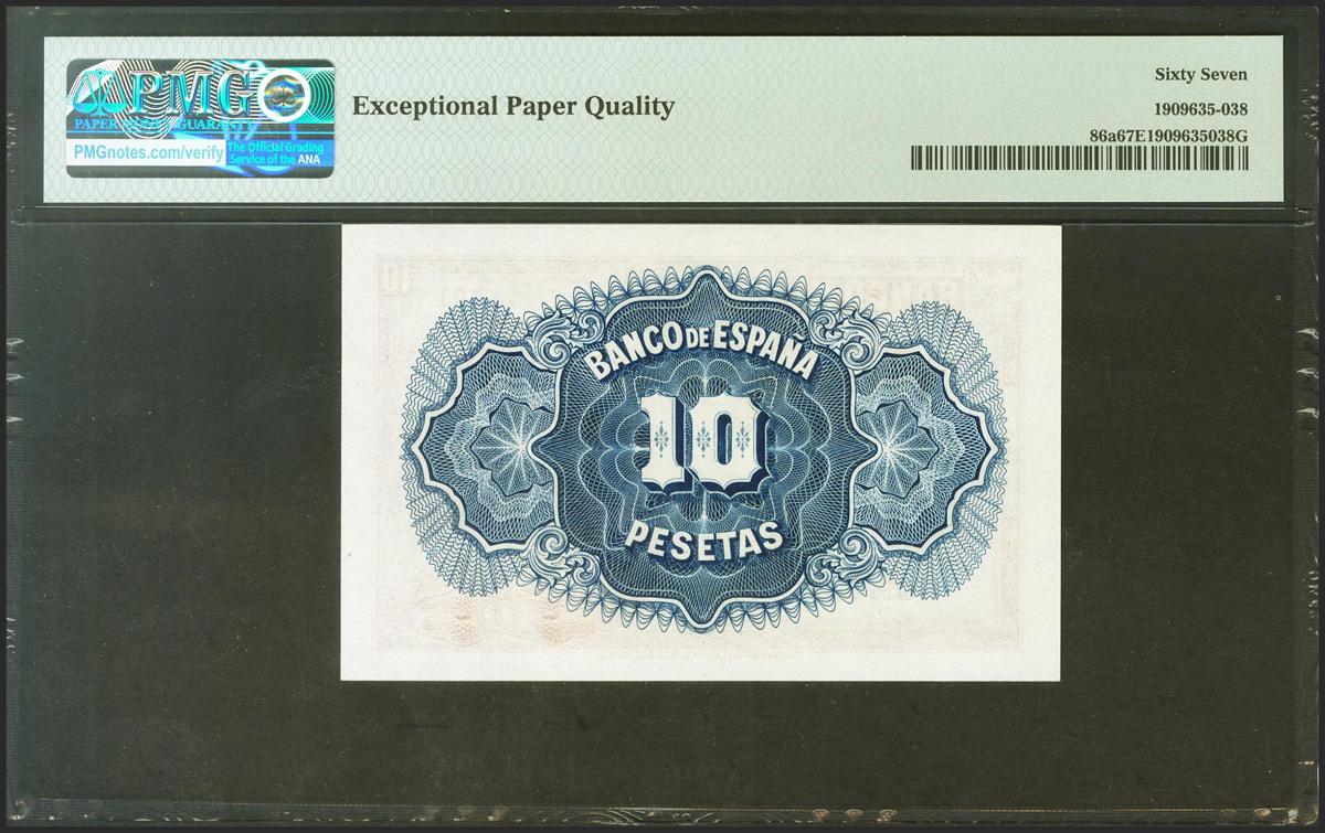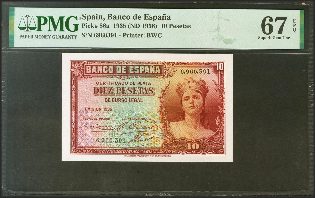 10 pesetas. 1935. Silver Certificate. No serie. (Edifil 2021: 364, 86a). Rare in this exceptional quality, original sizing. Uncirculated. PMG67EPQ package.