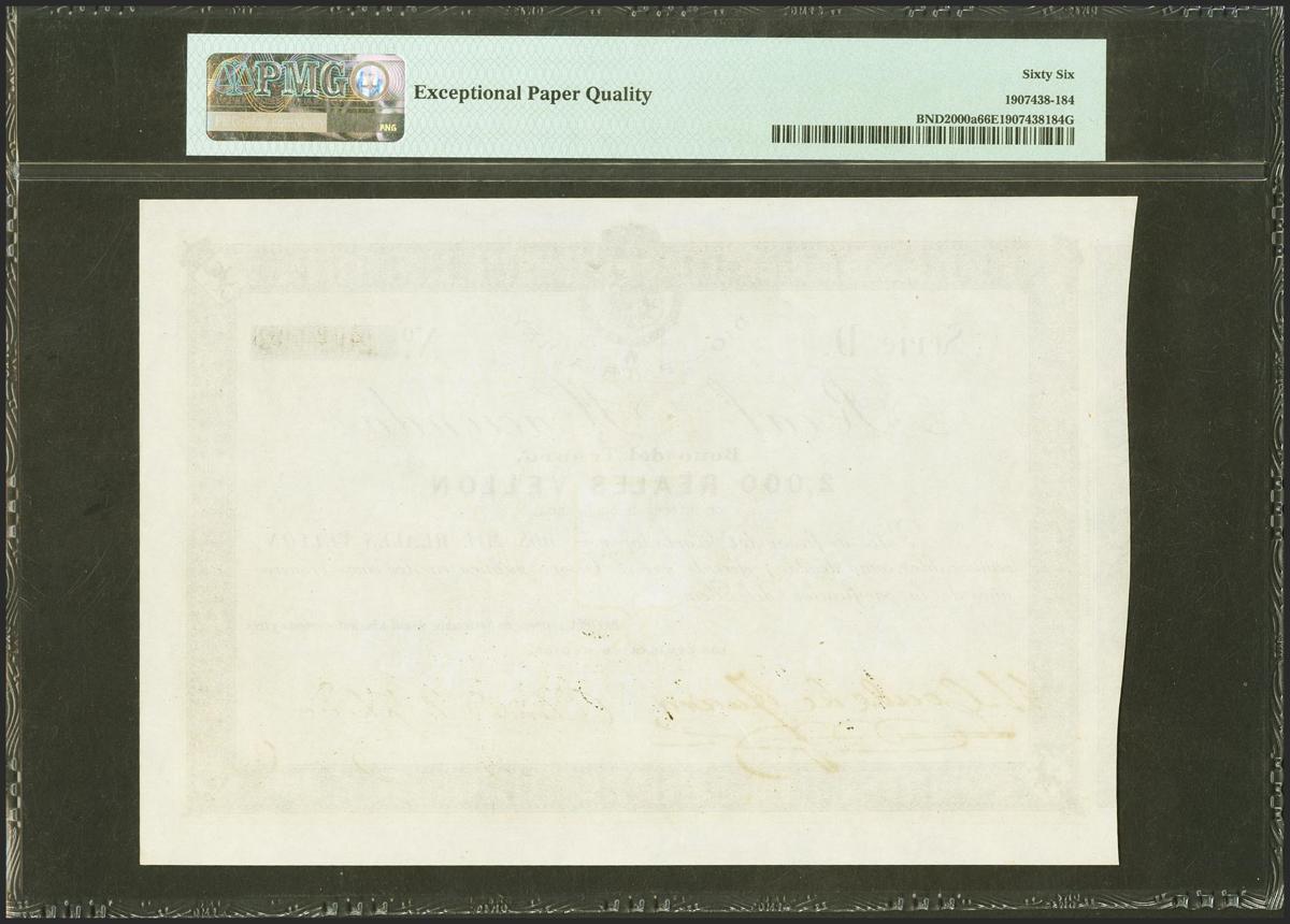 2000 Reales from Fleece. November 1, 1873. Real Treasury. Series D. (Edifil 2021: 213). Unusual in this exceptional quality, original sizing. Uncirculated. PMG66EPQ package.