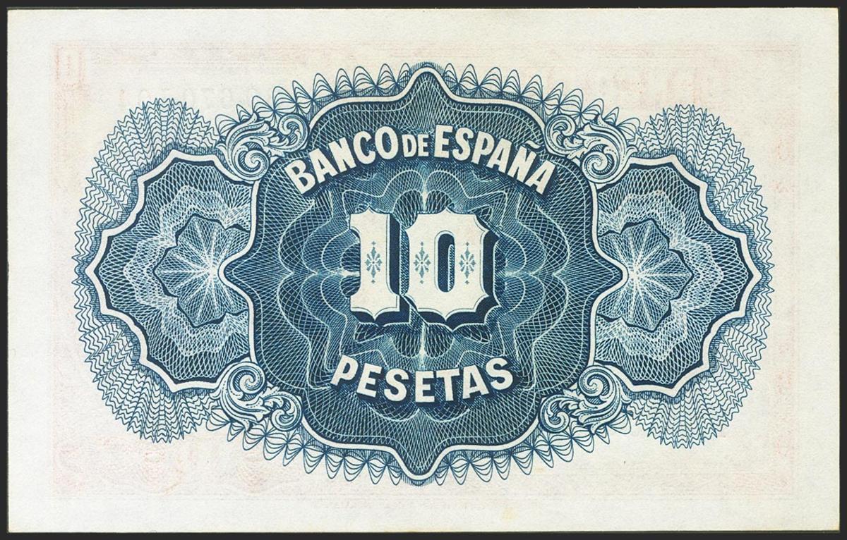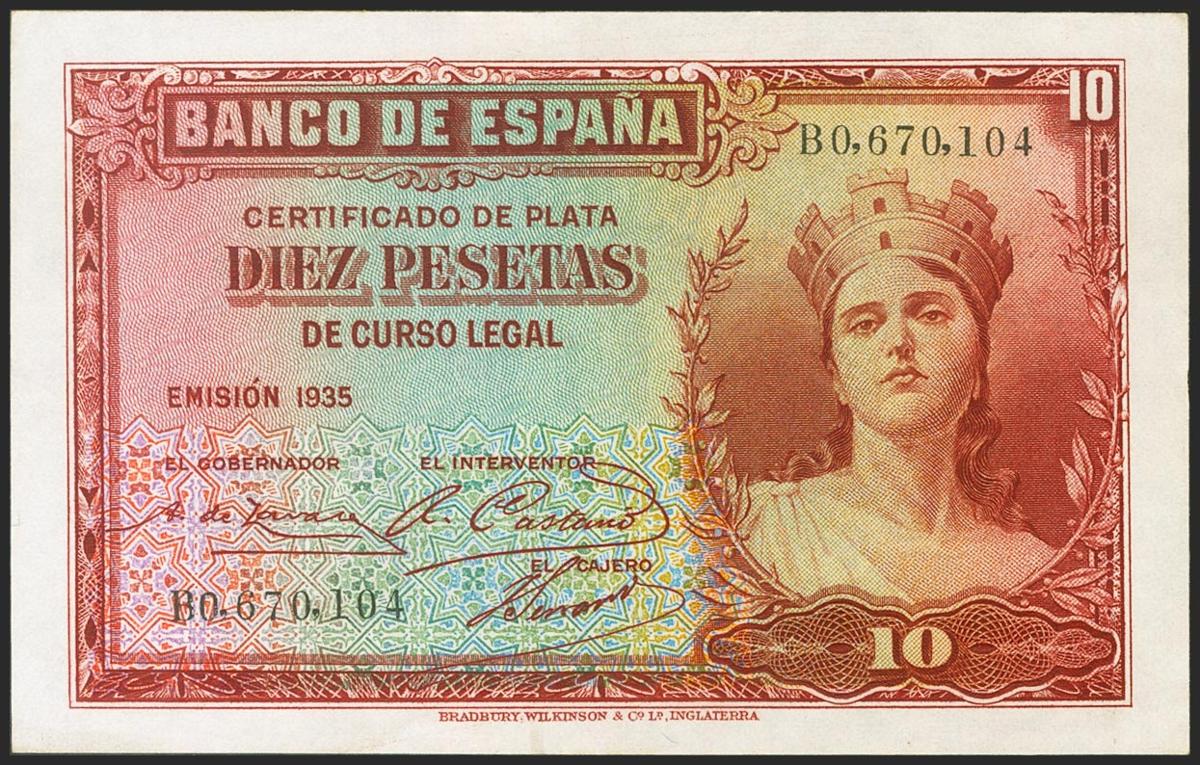 English 10 pesetas. 1935. Silver Certificate. Series B. (Edifil 2021: 364a). Original sizing. Uncirculated.