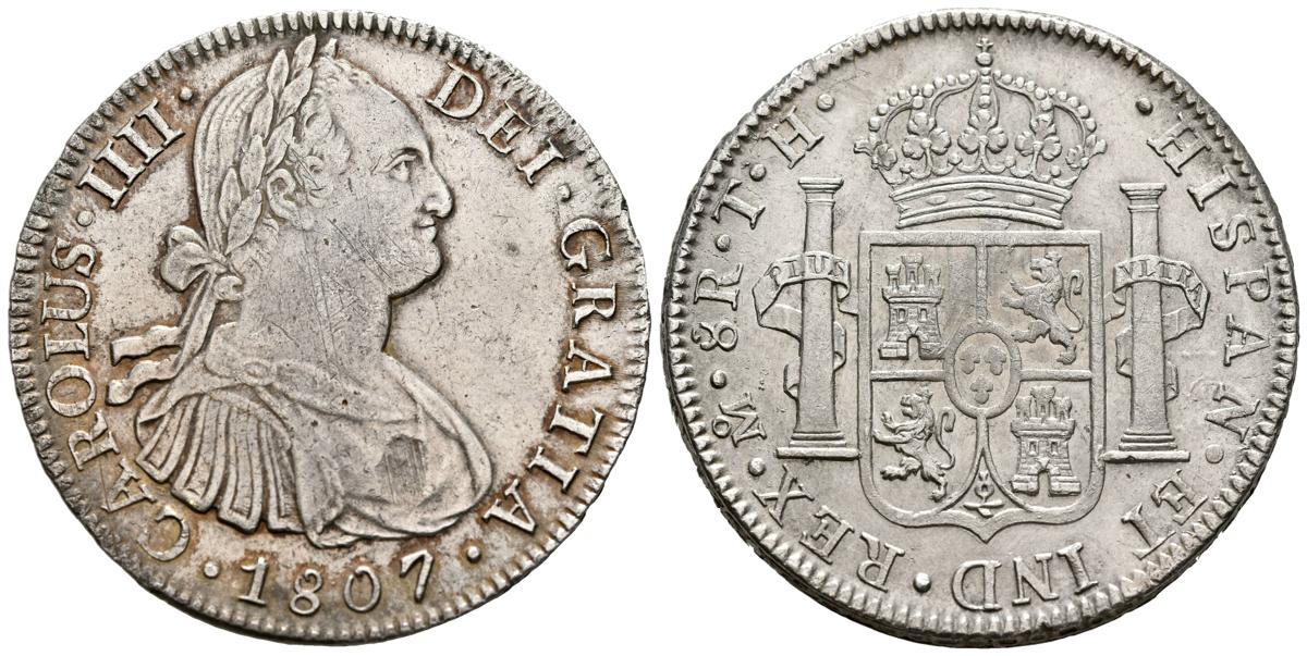 English CARLOS IV (1788-1808). 8 Reales. (Ar. 26.93g/40mm). 1807. Mexico TH. (Cal-2019-986). Extremely Fine. Scratch on obverse. Remnants of original shine. Nice specimen, rare like this.
