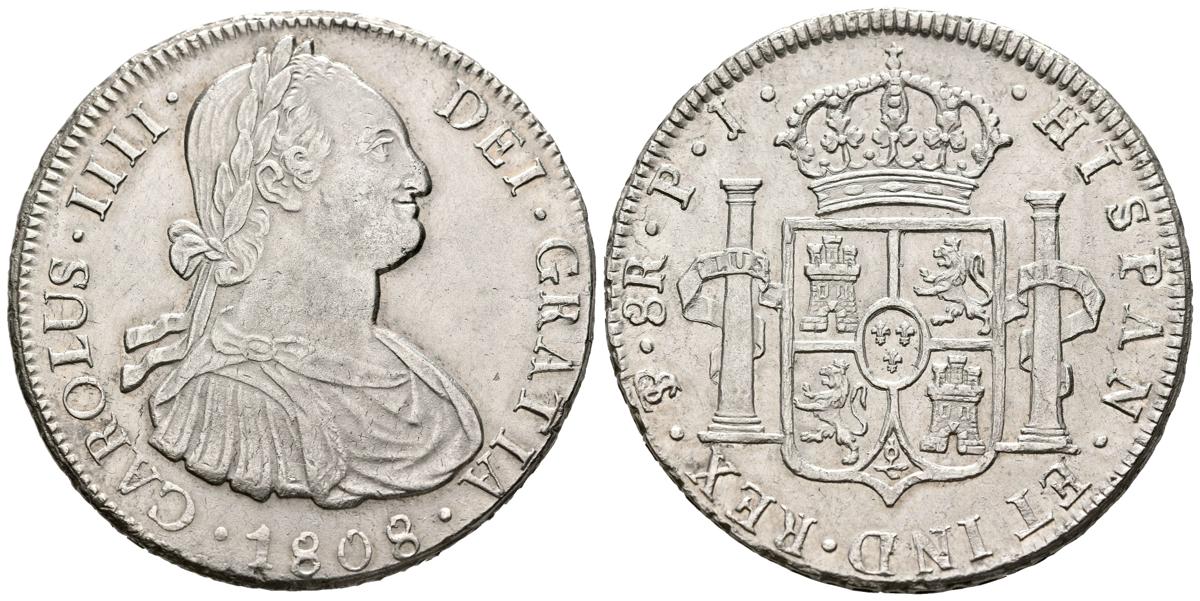 CARLOS IV (1788-1808). 8 Reales. (Ar. 26.92g/40mm). 1808. Potosi PJ. (Cal-2019-1014). Almost Extremely Fine. Remnants of original shine. Nice specimen.