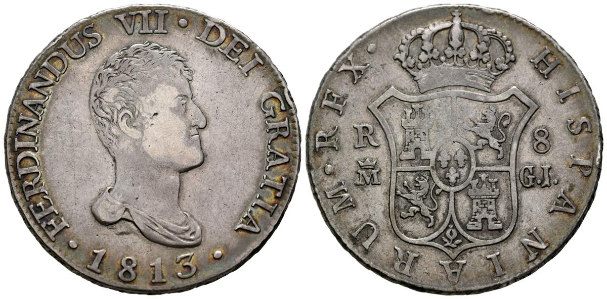 FERDINAND VII (18080-1833). 8 Reales. (Ar. 26.70g/39mm). 1813. Madrid GJ. (Cal-2019-1266). Naked bust. Very Fine. Rare specimen.