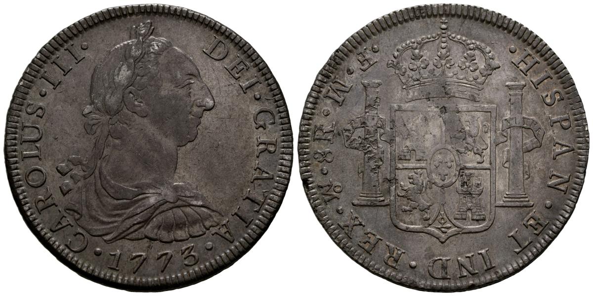 CARLOS III (1759-1788). 8 Reales (Ar. 26.84g/41mm). 1773. Mexico FM. (Cal-2019-1106). Inverted mint and assayers. Good Very Fine. dark patina