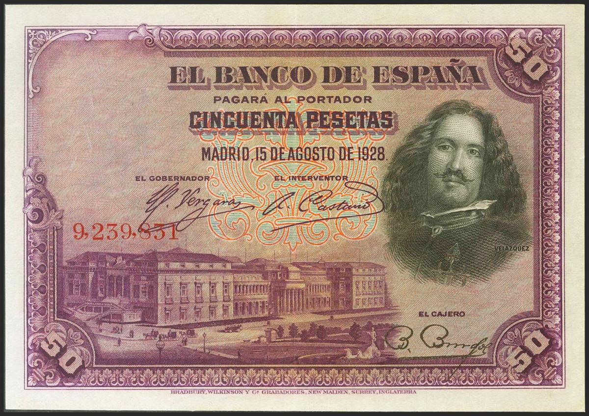 50 pesetas. August 15, 1928. No series. (Edifil 2021: 329). Unusual, retains much of the original sizing. Extremely Fine.