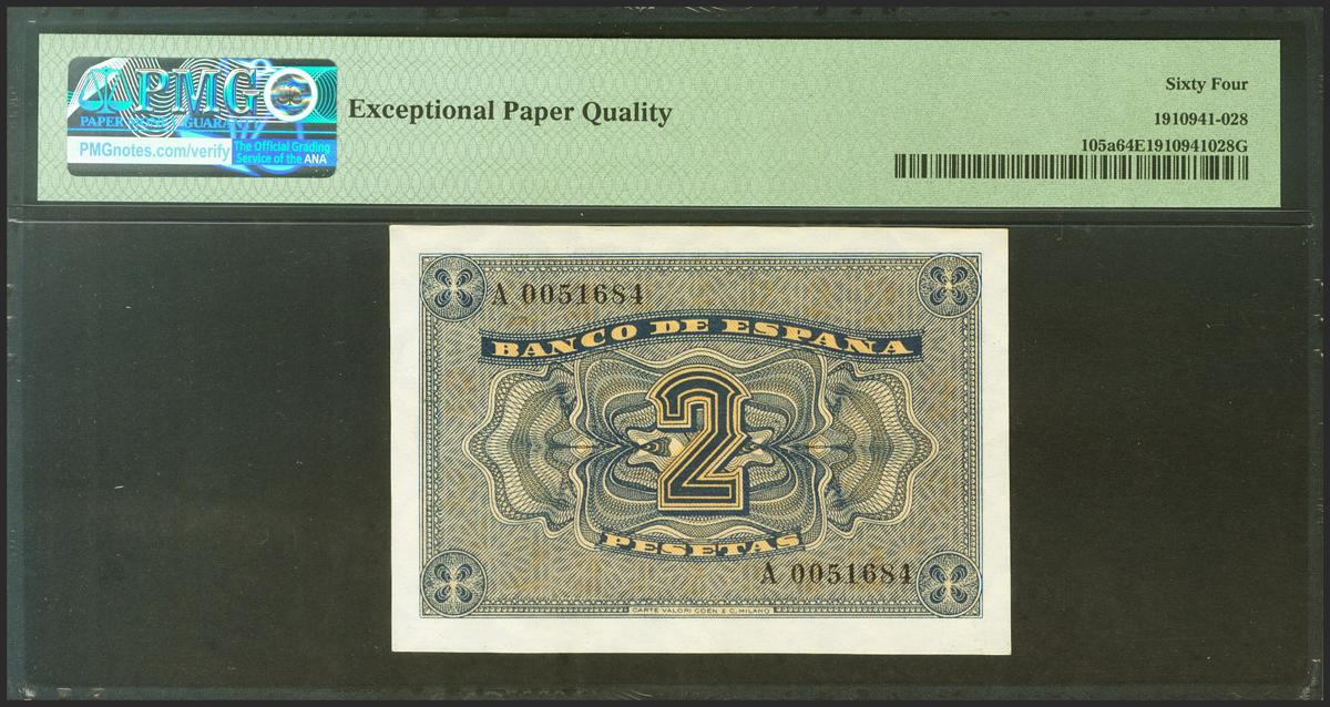 2 pesetas. October 12, 1937. Series A. (Edifil 2017: 426, Pick: 105). Original sizing. Uncirculated. PMG64EPQ package.
