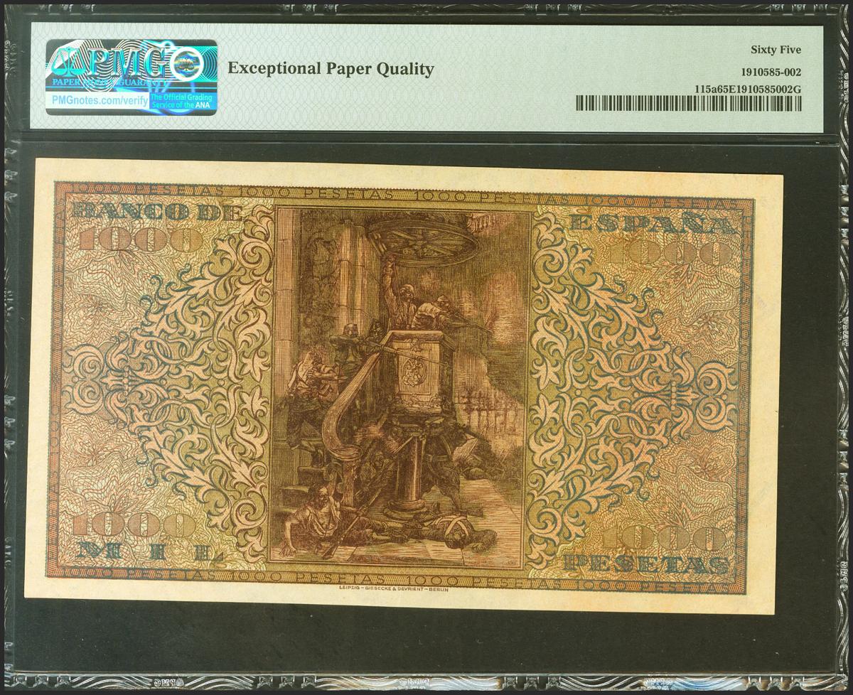 1000 Pesetas. May 20, 1938. Series A and low numbering. (Edifil 2021: 434, Pick: 115a). Very rare, especially in this exceptional quality, original sizing. Uncirculated. PMG65EPQ package.