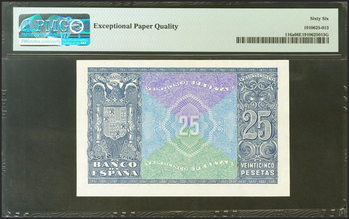 25 pesetas. January 9, 1940. Series D. (Edifil 2021: 436a, Pick: 116a). Rare in this quality, original sizing. Uncirculated. PMG66EPQ package.