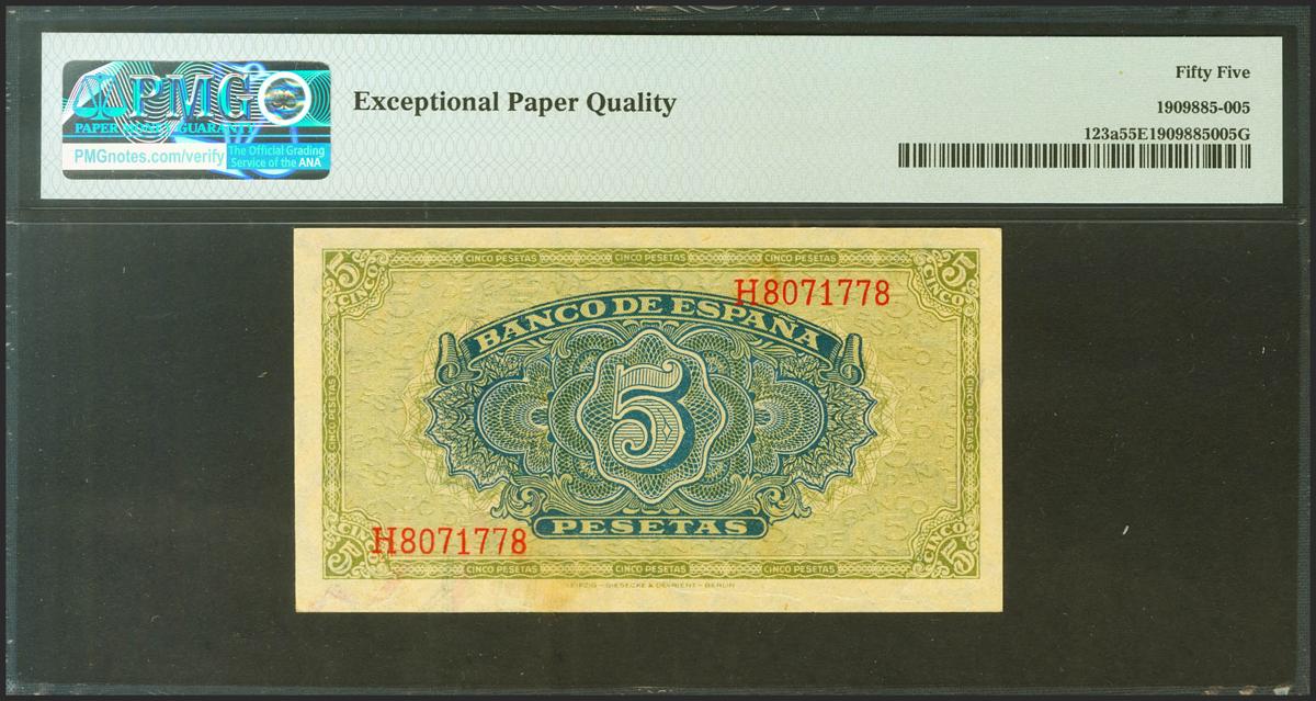 English 5 pesetas. September 4, 1940. Series H. (Edifil 2021: 443a, Pick: 123a). Original sizing. Good Extremely Fine. PMG55EPQ package.