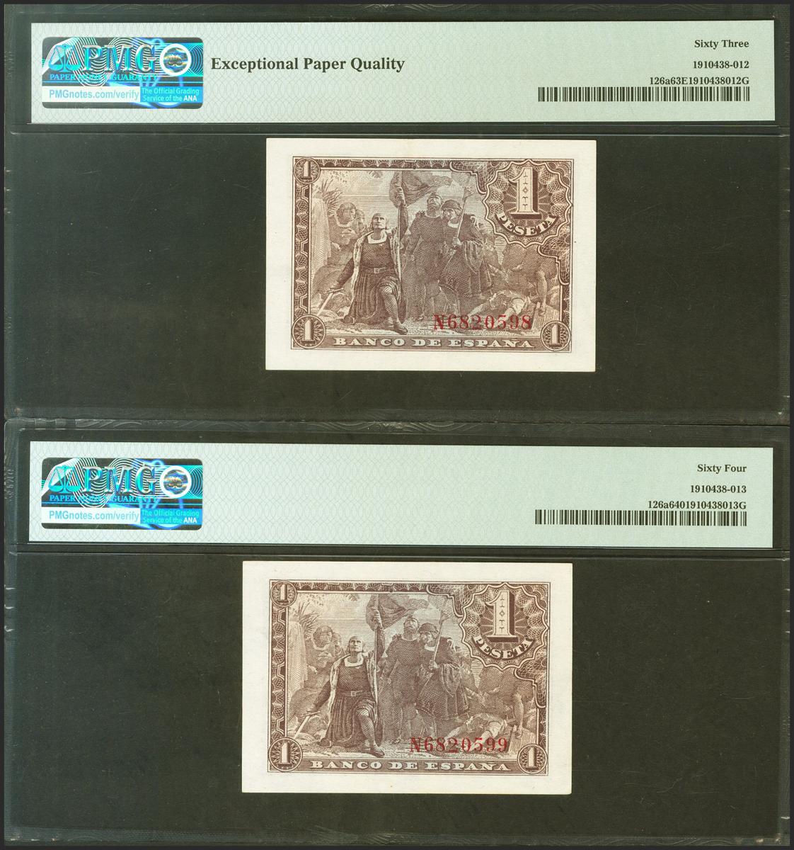 1 Peseta. May 21, 1943. Correlative couple. Series N, last series issued. (Edifil 2021: 447a, Pick: 126a). Original sizing. Uncirculated. PMG63EPQ/64 packages.