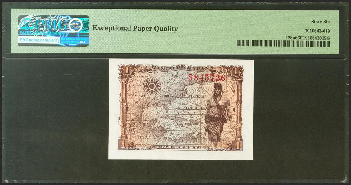 1 Peseta. June 15, 1945. No series. (Edifil 2021: 448, Pick: 128a). Original sizing. PMG66EPQ package.