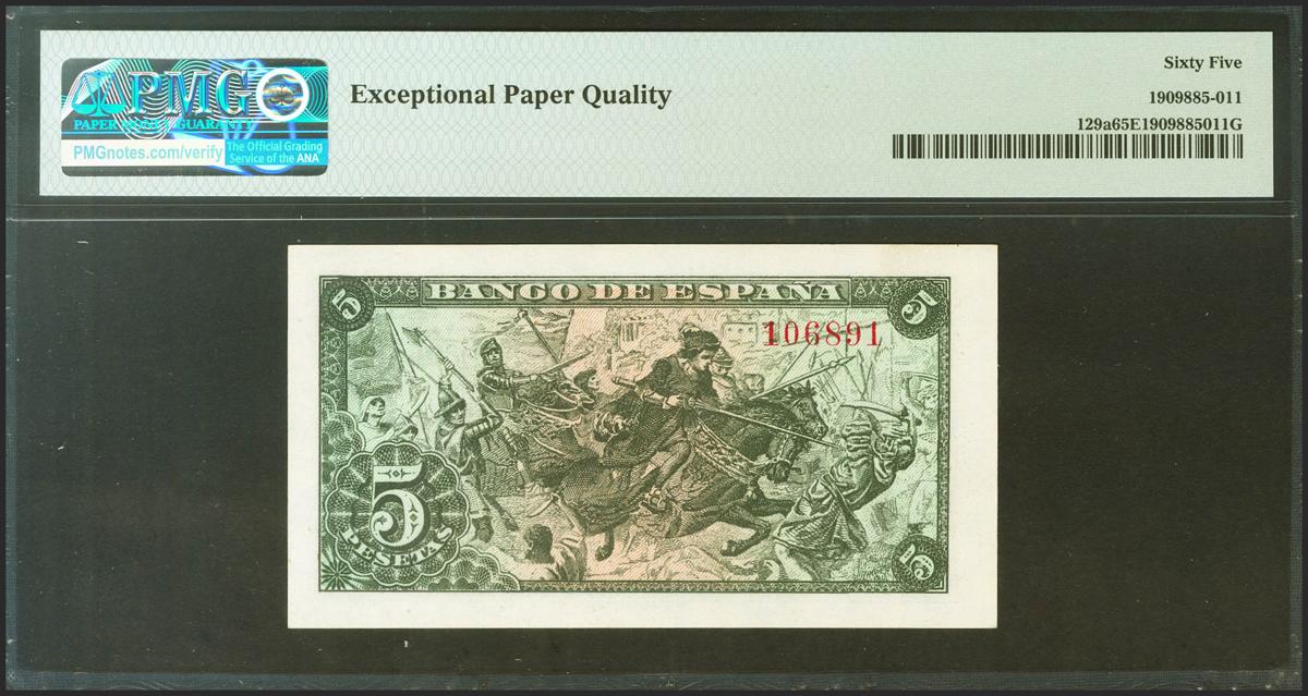 5 pesetas. June 15, 1945. No series. (Edifil 2021: 449, Pick: 129a). Rare in this quality, original sizing. Uncirculated. PMG65EPQ package.