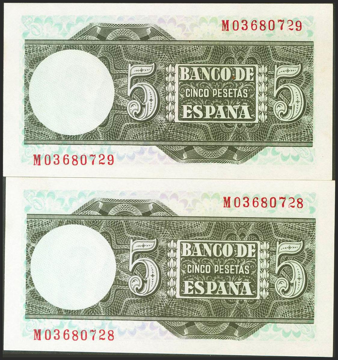 5 pesetas. March 5, 1948. Correlative couple. Series M. (Edifil 2021: 455a). Original sizing. Uncirculated.