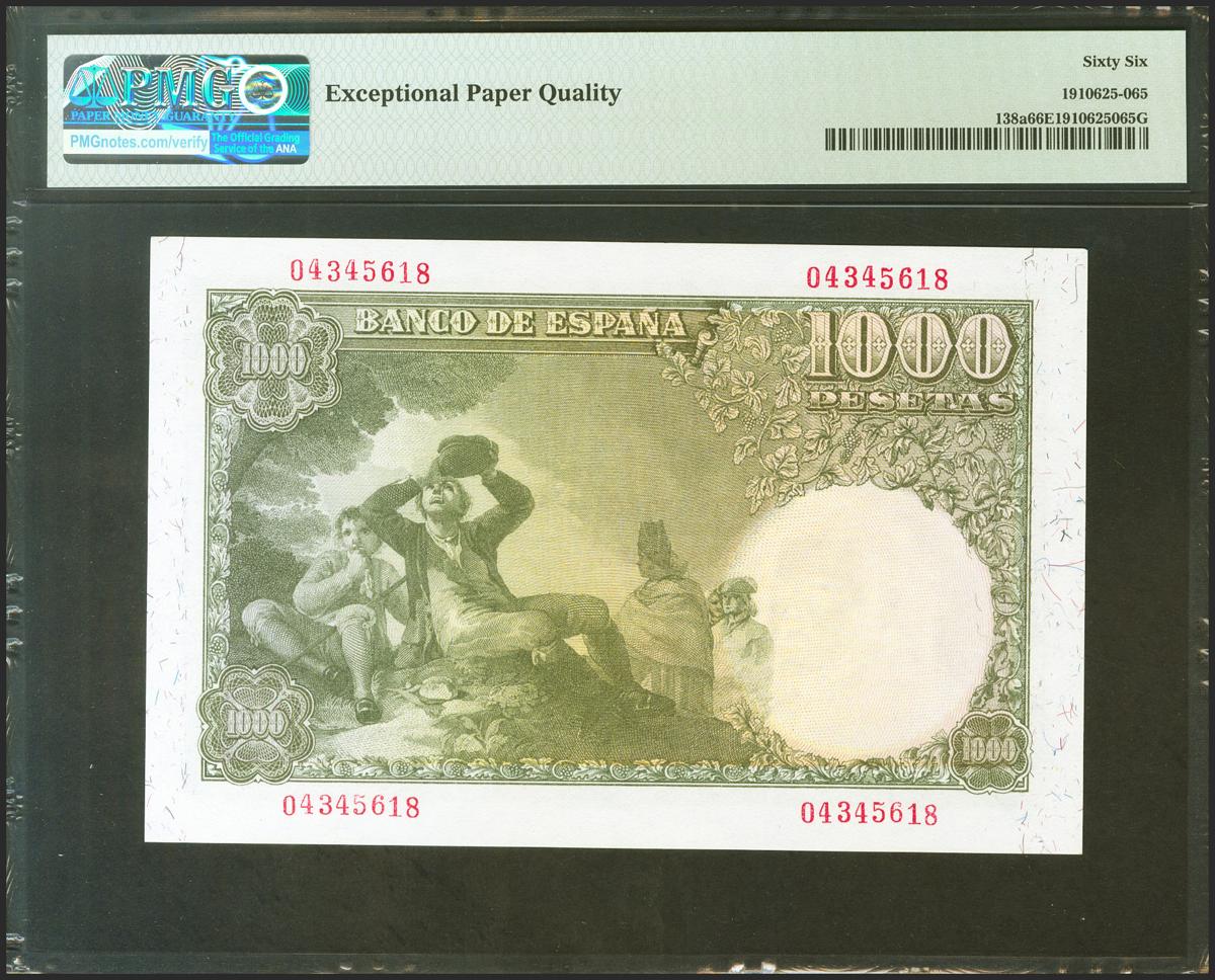 1000 Pesetas. November 4, 1949. No series. (Edifil 2021: 458, Pick: 138a). Very rare in this exceptional quality, original sizing. Uncirculated. PMG66EPQ package. (To get an idea of the rarity, as of July 1, 2022, this note is the best rated along with 7 other PMG notes)