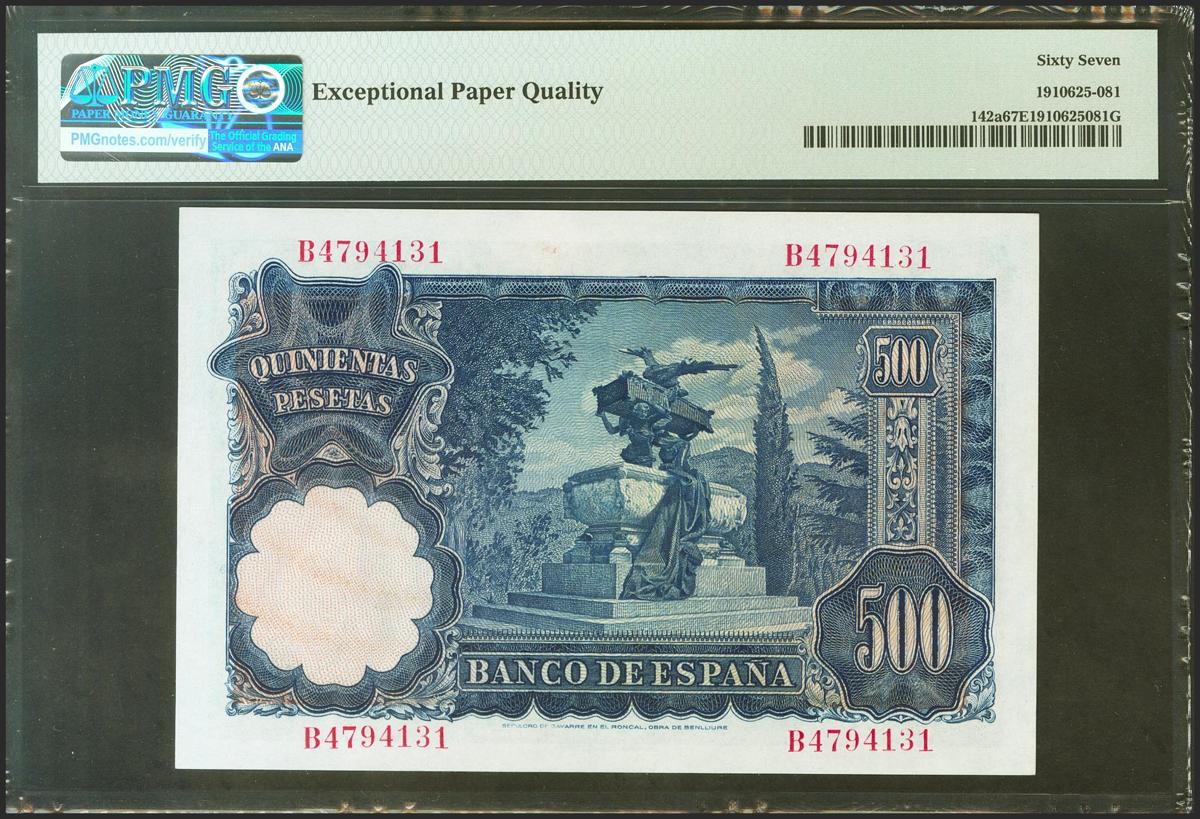 English 500 pesetas. November 15, 1951. Series B. (Edifil 2021: 460a, Pick: 142a). Rare in this exceptional quality, original sizing. Uncirculated. PMG67EPQ package.