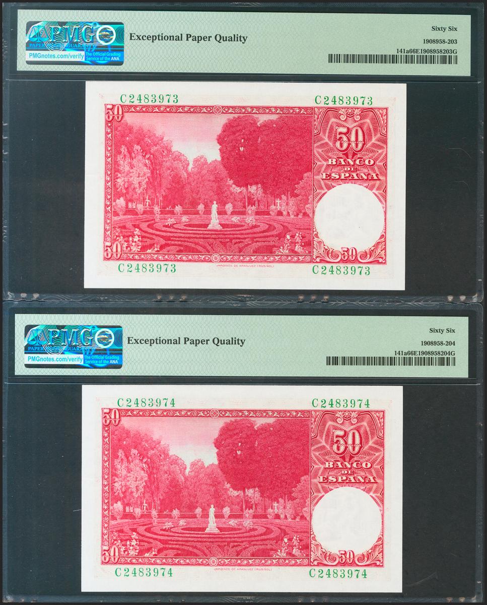 50 pesetas. December 31, 1951. Correlative couple. Series C. (Edifil 2021: 462a, Pick: 141a). Very rare in this quality, original sizing. Uncirculated. PMG66EPQ package, both.