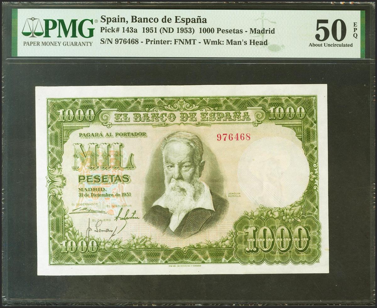 1000 Pesetas. December 31, 1951. No series. (Edifil 2021: 463, Pick: 143a). Original sizing. Extremely Fine. PMG50EPQ package.
