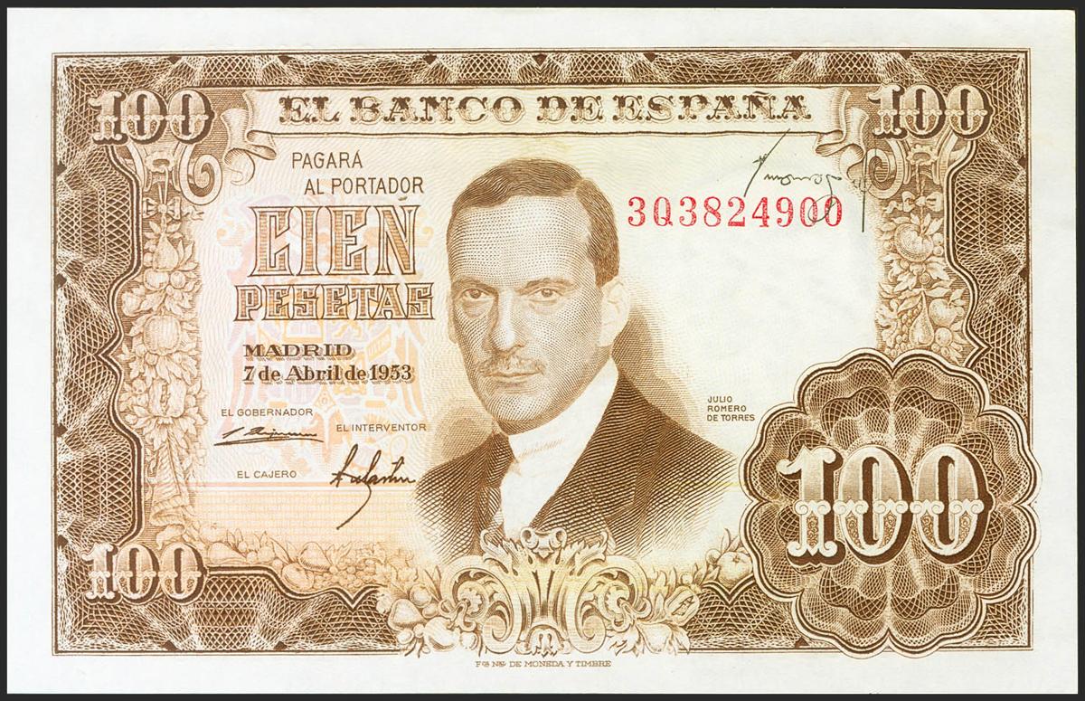 100 pesetas. April 7, 1953. Series 3Q, cashier's signature inverted and at the top. (Edifil 2021: 464c). Original sizing. Uncirculated.