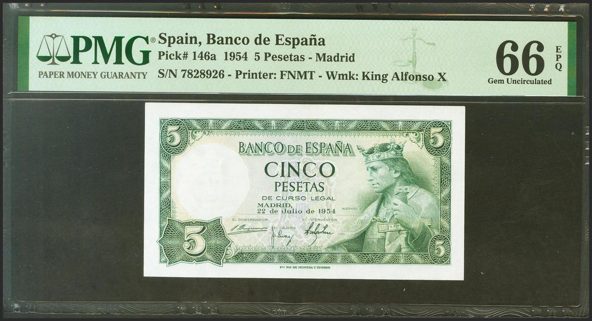 5 pesetas. July 22, 1954. No series. (Edifil 2021: 466, Pick: 146a). Unusual in this exceptional quality, original sizing. Uncirculated. PMG66EPQ package.