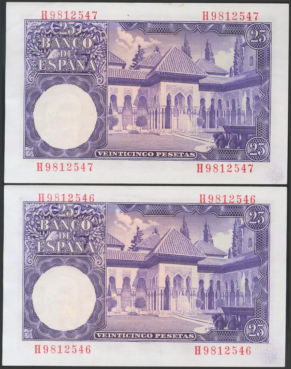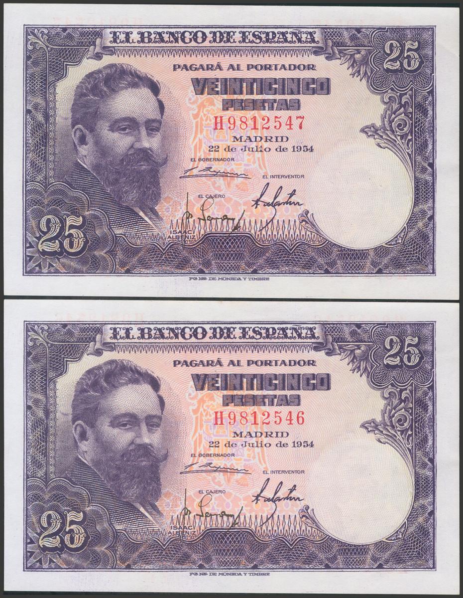 25 pesetas. July 22, 1954. Correlative couple. Series H. (Edifil 2017: 467a). It retains all its original sizing. Almost Uncirculated.