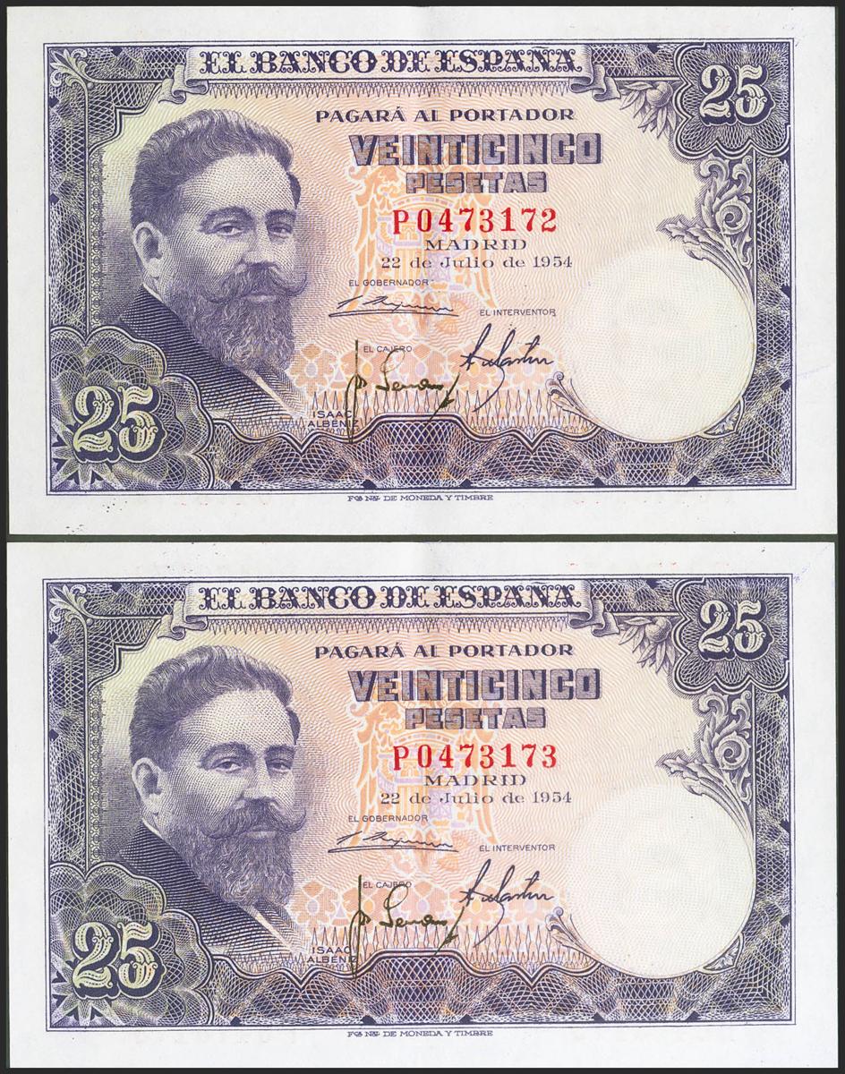 25 pesetas. July 22, 1954. Correlative couple. Series P, last series issued. (Edifil 2021: 467b). It retains much of its original sizing. Good Extremely Fine.