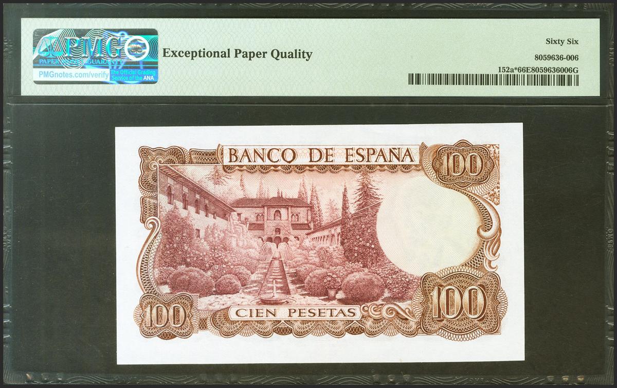 English 100 pesetas. November 17, 1970. Special series 9B. (Edifil 2021: 472d, Pick: 152a*). Unusual in this exceptional quality, original sizing. Uncirculated. PMG66EPQ package.