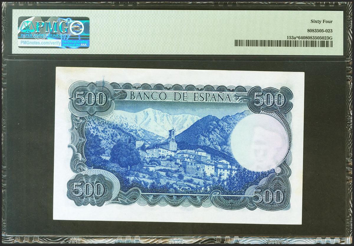 English 500 pesetas. July 23, 1971. Special series 9A. (Edifil 2021: 473b, Pick: 153a*). Unusual. Uncirculated. PMG64 package.