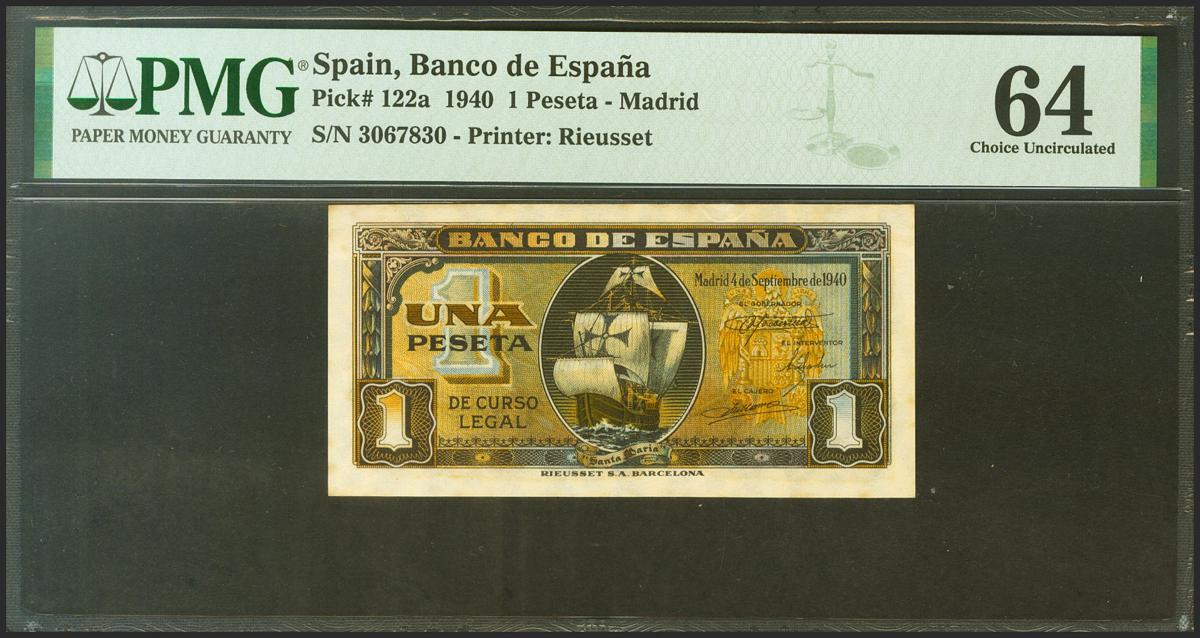 1 Peseta. September 4, 1940. No series. (Edifil 2021: 442, Pick: 122a). Unusual. Uncirculated. PMG64 package.