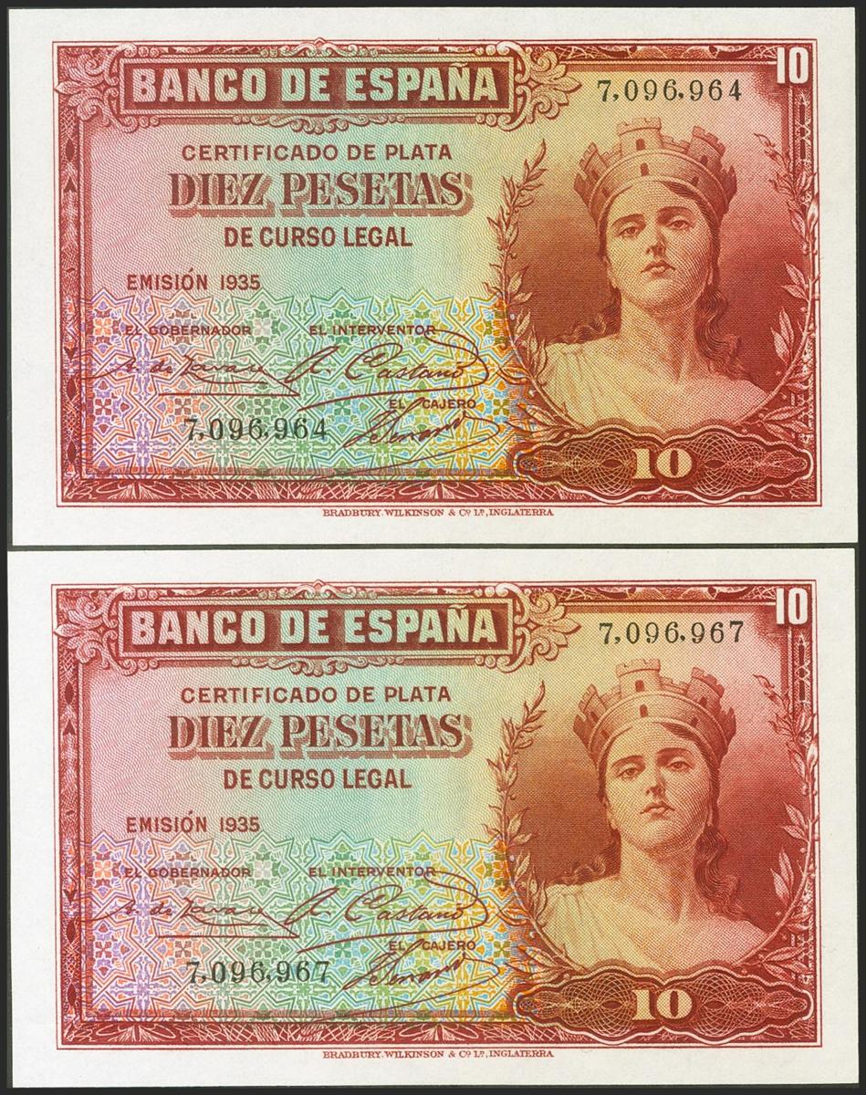 Set of 2 10 Pesetas Silver Certificate bills issued in 1935 and without series (Edifil 2021: 364), keeping all its original finish. Uncirculated.