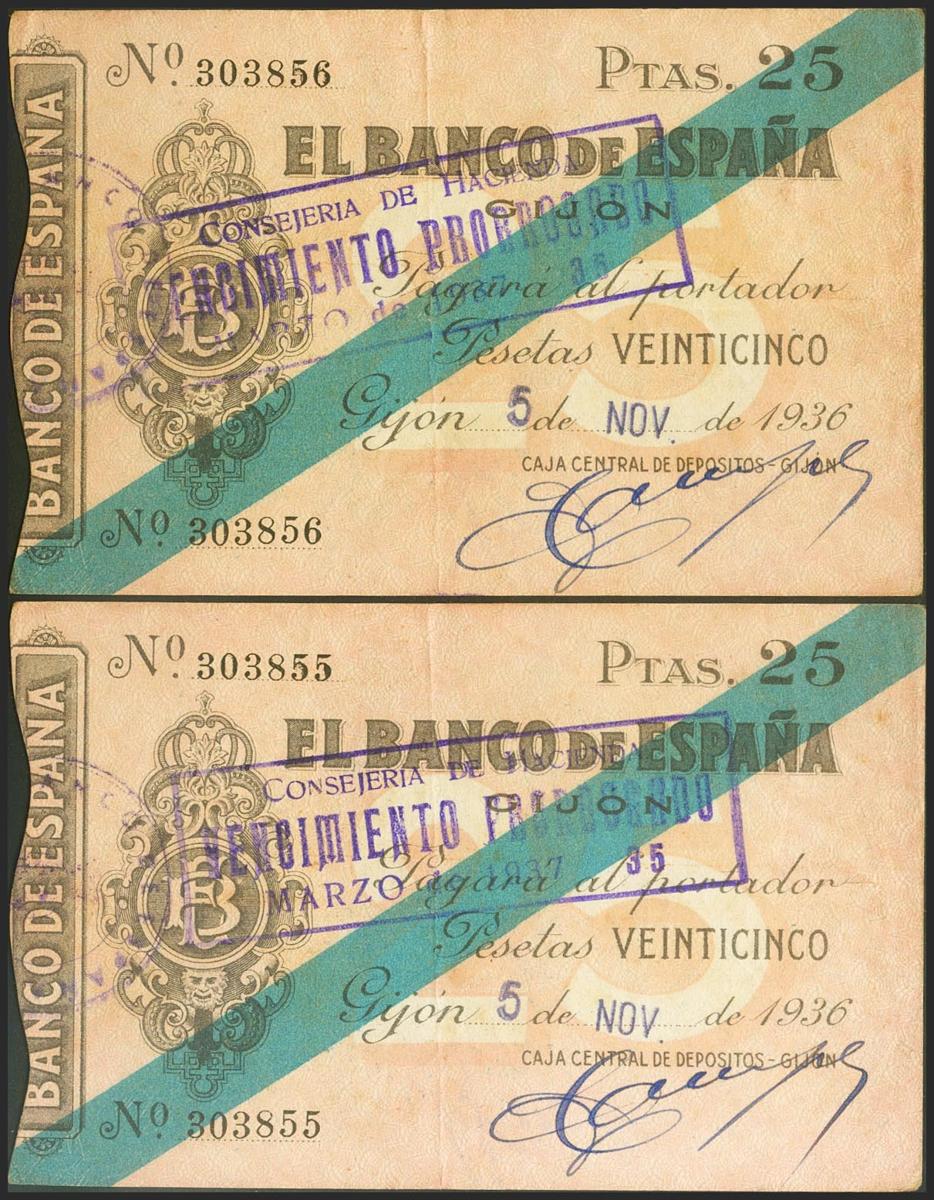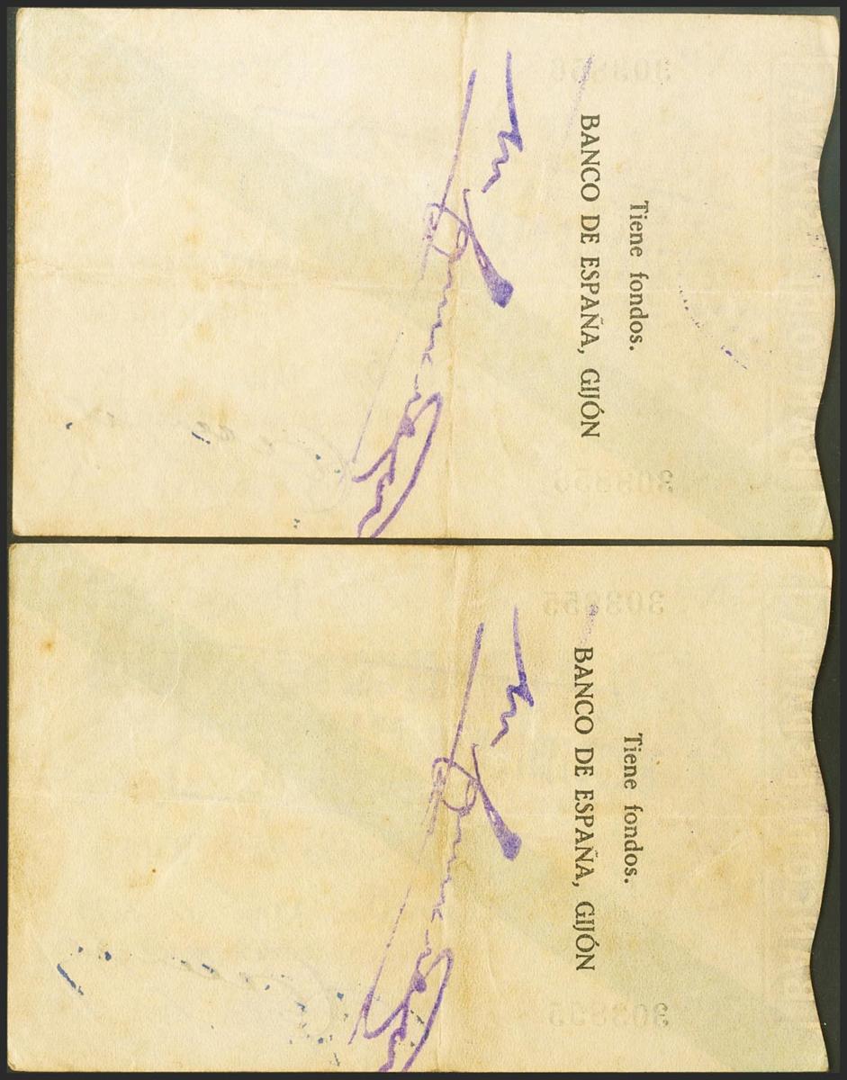 25 pesetas. November 5, 1936. Gijón branch. Correlative pair. No serie. (Edifil 2021: 382). Very rare pair, especially in this quality for this banknote, which is always in low qualities. Almost Extremely Fine.