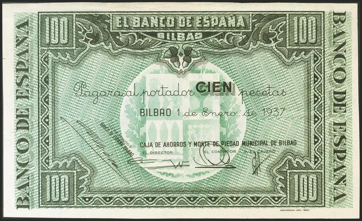 100 pesetas. January 1, 1937. Bilbao branch, signed by Caja de Ahorros y Monte de Piedad Municipal de Bilbao. No series and no numbering. (Edifil 2021: 390c). Original sizing. Good Extremely Fine.