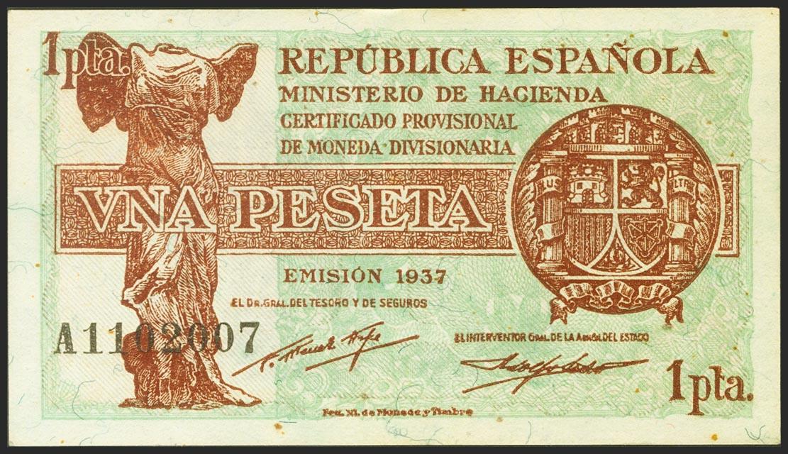 1 Peseta. 1937. Ministry of Finance. Series B. (Edifil 2021: 392). Original sizing, typical dots. Almost Uncirculated.