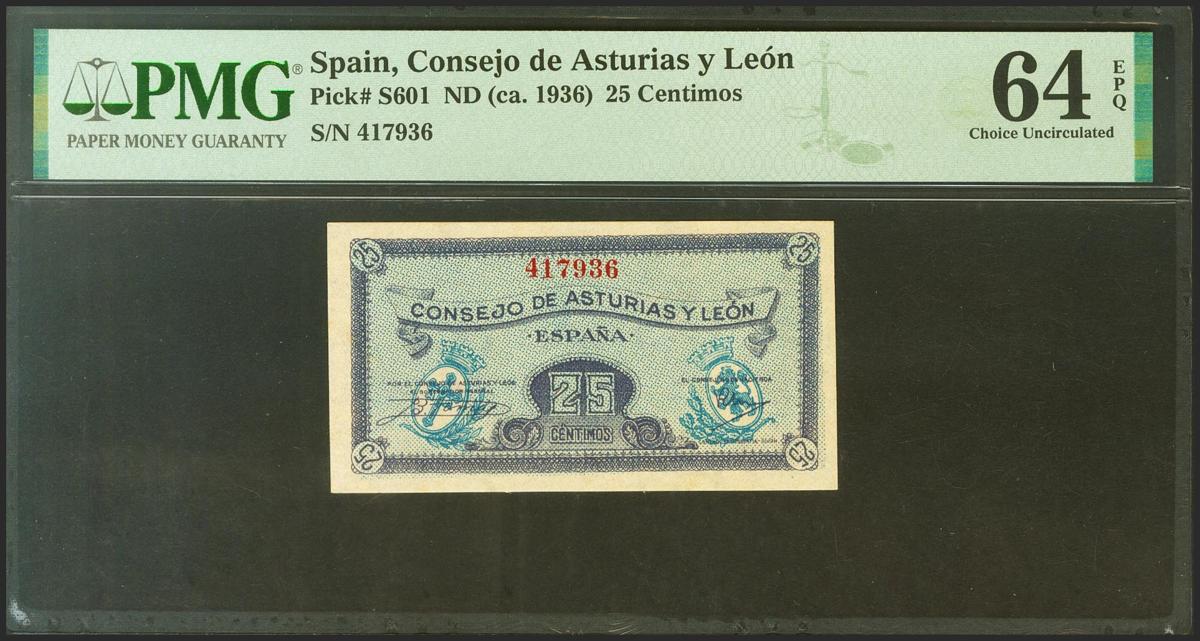 25 cents. 1937. Asturias and León. No serie. (Edifil 2021: 394, Pick: S601). Original sizing. Uncirculated. PMG64EPQ package.