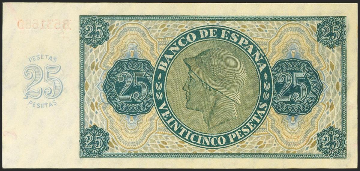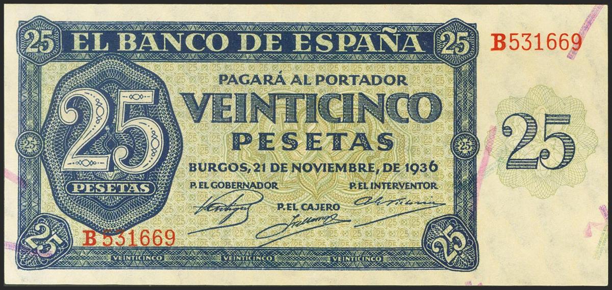25 pesetas. November 21, 1936. Series B. (Edifil 2021: 419a). Rare in this quality, it retains all its original sizing. Almost Uncirculated.