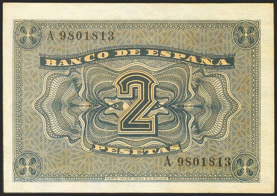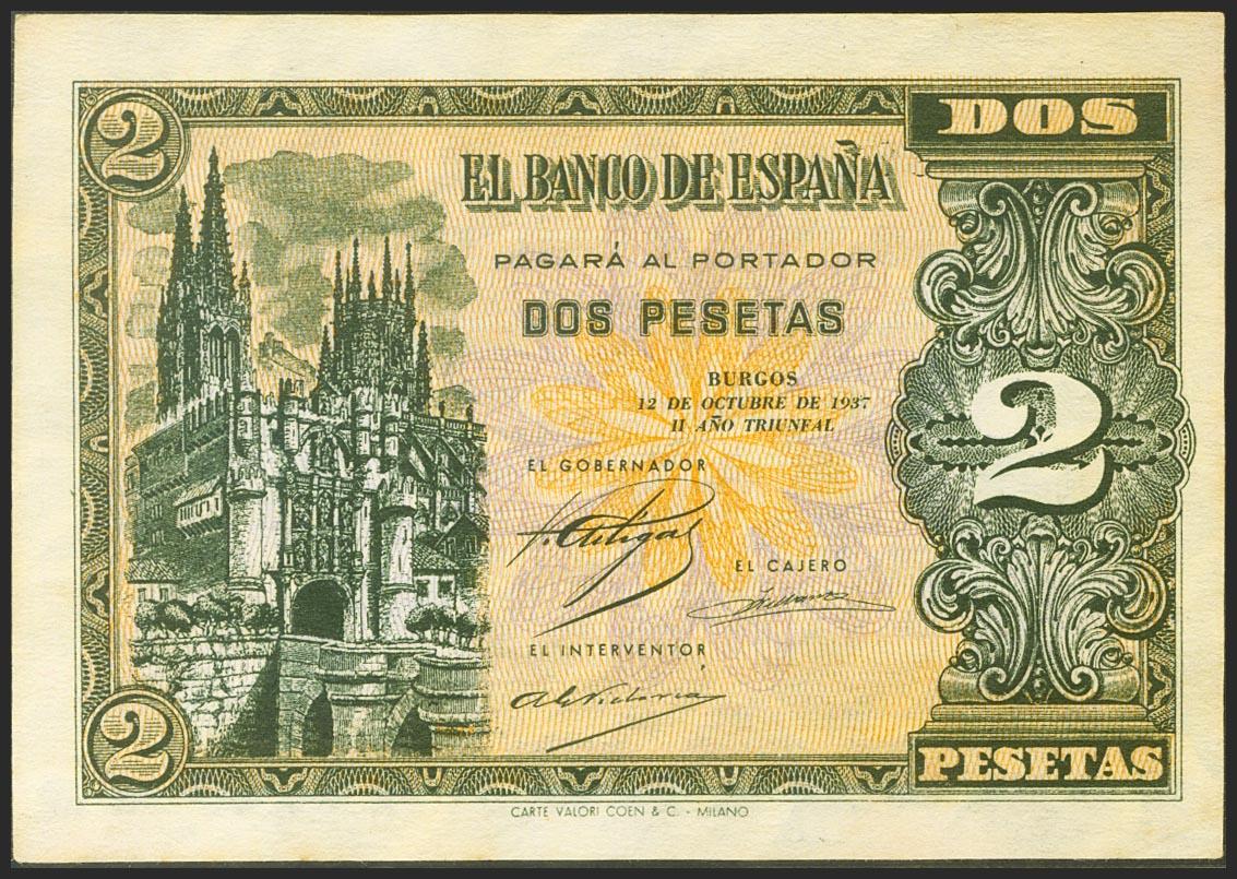 2 pesetas. October 12, 1937. Series B. (Edifil 2021: 426a). Unusual, original sizing, stains of time. Almost Uncirculated.